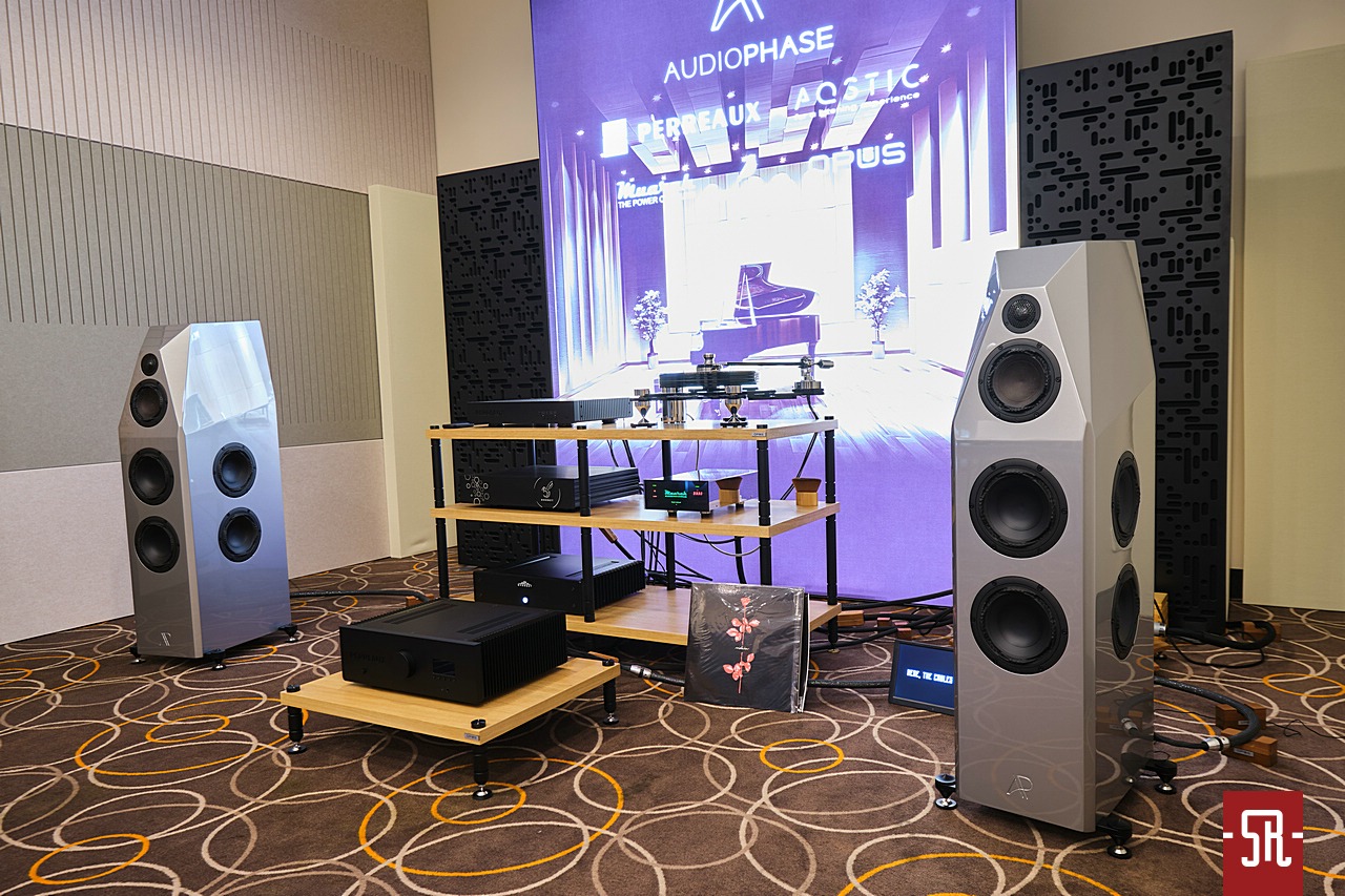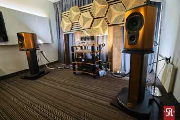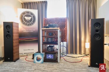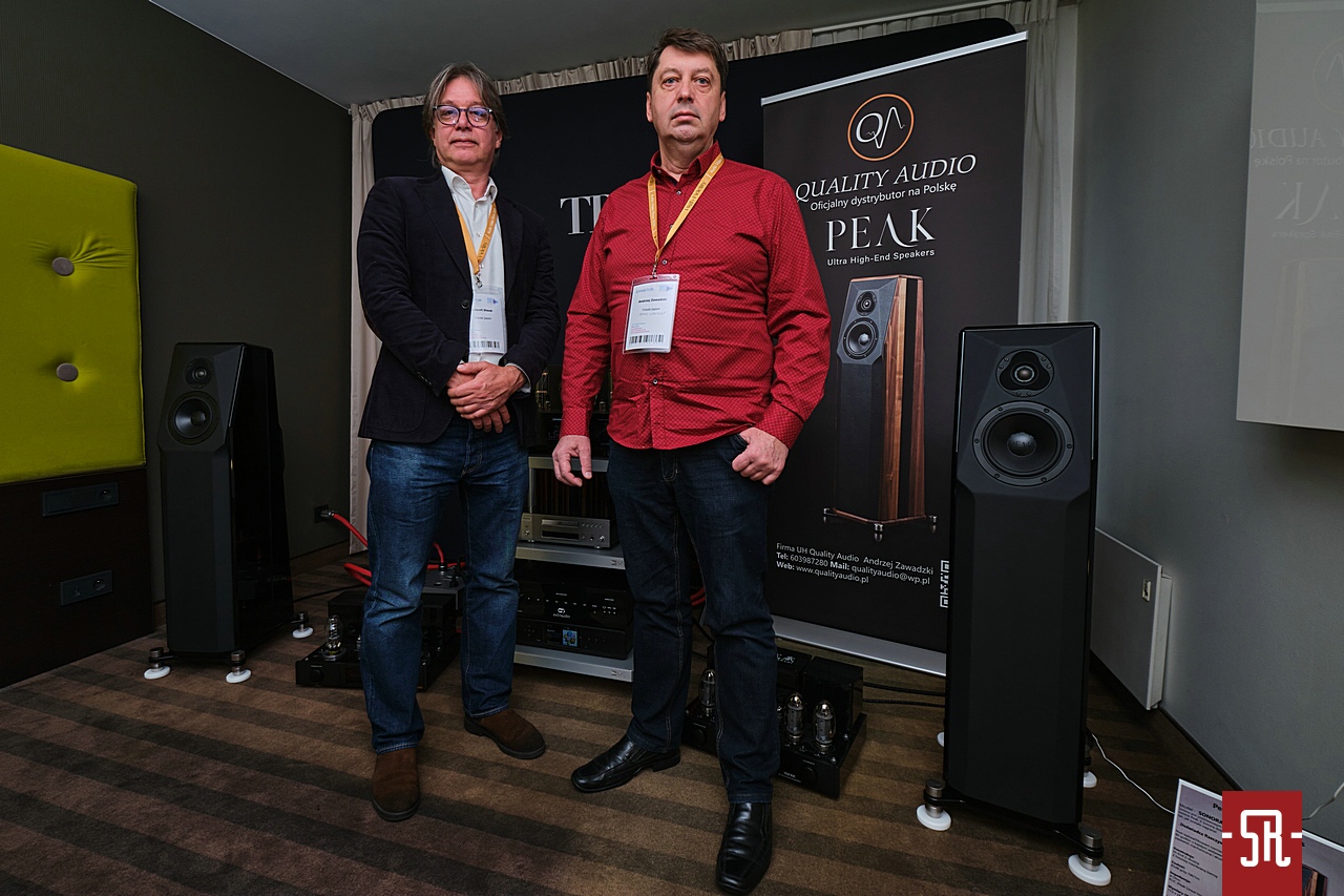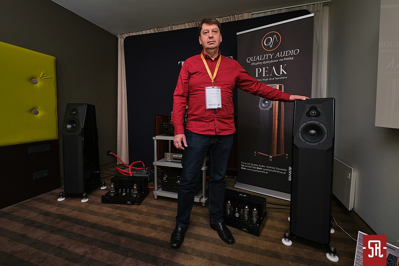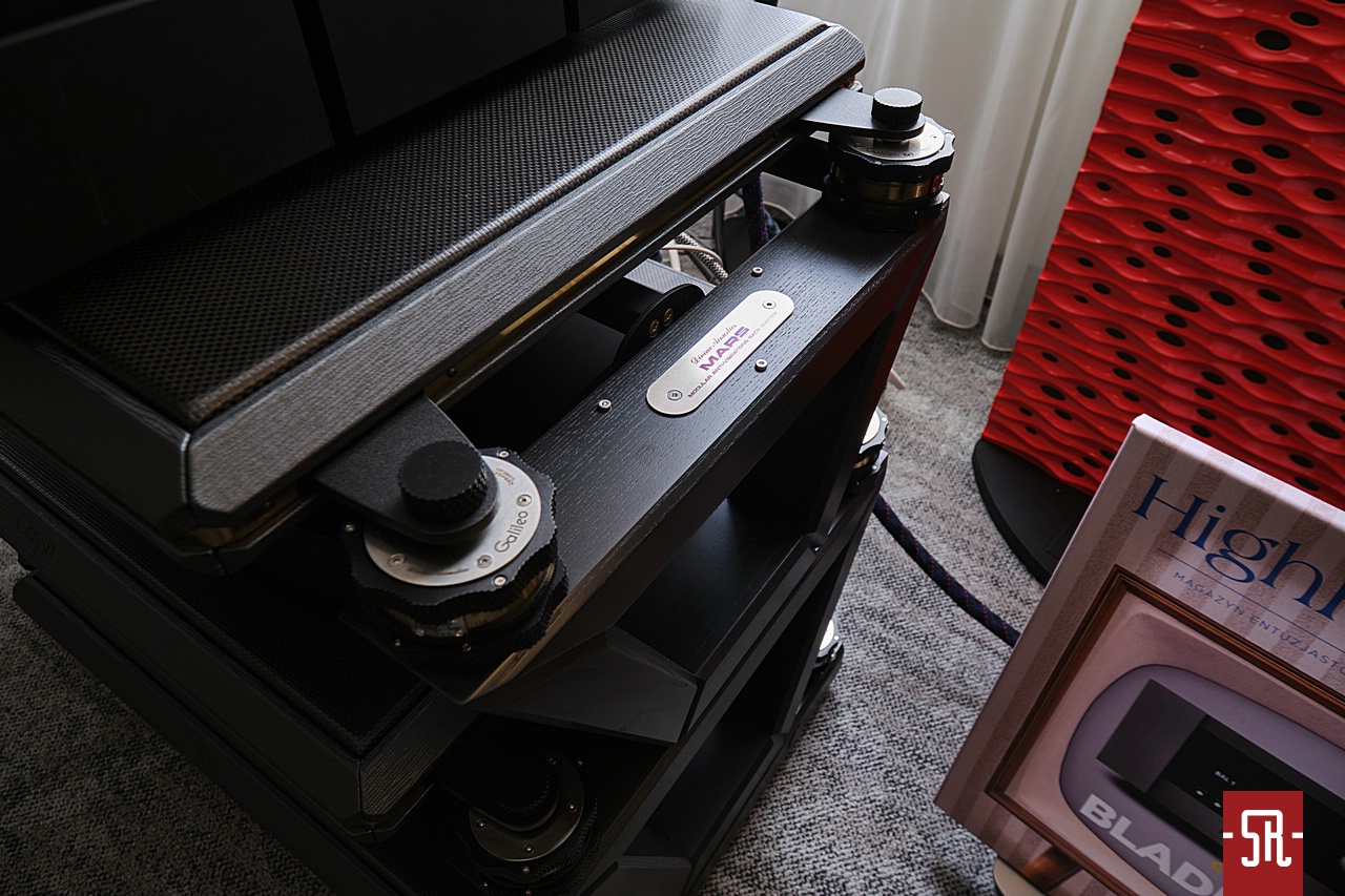 W zauważalnie mniej kontrowersyjnej estetyce utrzymane były za to oparte na diamentowych tweeterach Bliesma i średnio + niskotonowcach Puriffi kolumny AudioPhase STEALTH One. Towarzyszyło im okablowanie Next Level Tech NxLT Ether, gramofon Muarah i elektronika Perreaux. I tu ciekawostka, bowiem chociaż w ramach tego typu relacji staram się nie rozpisywać na temat dźwięku, to w tym systemie podczas dwóch moich wizyt każdorazowo dźwięk brzmiał jakby gramofon zdecydowanie „przyspieszał” obroty, gdyż nawet znane mi nagrania miały podniesioną równowagę tonalną i szybsze aniżeli zazwyczaj tempa. Pytanie czy miałem takie szczęście, że dwukrotnie udało mi się załapać na tego typu anomalie, czy po prostu „ten typ tak ma”.