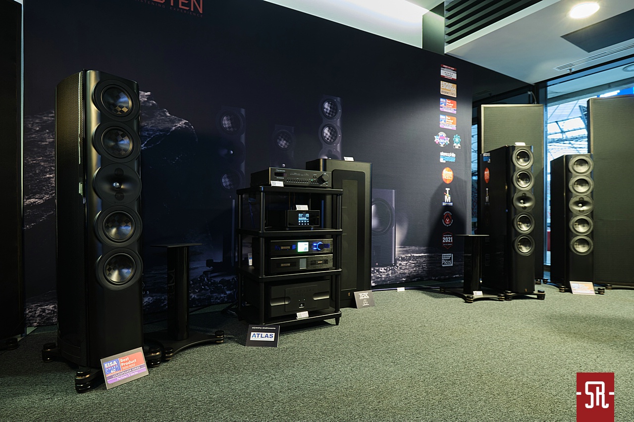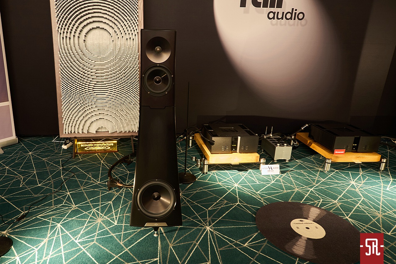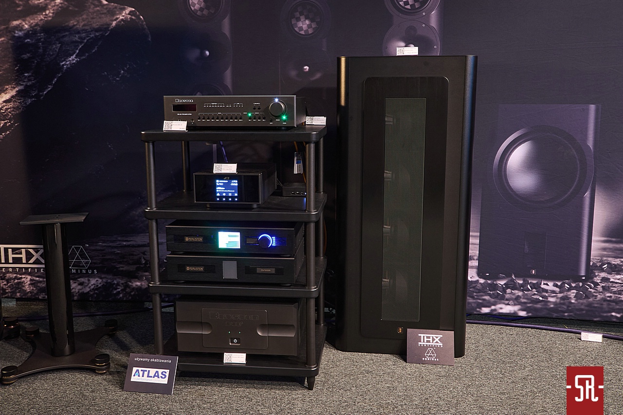 To ma się rozumieć białostocki dystrybutor Rafko i do tego w tym konkretnym pomieszczeniu wystawiający pełną gamę kolumn Perlisten. Nie wiem, czy wiecie, ale to wbrew pozorom bardzo ciekawa marka. Niby w podstawowej formie dedykowana dla kina domowego z istotnym w najwyższym standardzie jakości obrazu i dźwięku THX, jednak jest na tyle dobrze zaprojektowana, że równie dobrze radzi sobie w wysublimowanym odtwarzaniu muzyki w trybie stereo. Jeśli ktoś jest tym faktem zaskoczony, zalecam poszukać naszych opisów jak na dość krótki staż marki w portfolio Rafko stosunkowo sporej liczby konstrukcji. A były nimi nie tylko modele proste podstawkowe i wolnostojące, ale także ich wersje rocznicowe, co pokazuje, że firma jest prężna w działaniu na każdym wspomnianym polu od wielu lat. Jaki był konkretny cel wizyty? Otóż podczas niedawno opisywanej przez nas wyprawy na jubileusz tego dystrybutora odbywały się warsztaty na temat posiadanych w ofercie marek. Naturalnie jedną z nich jest omawiany Perlisten, który wówczas jeszcze na zdjęciach pokazywał najnowszy pomysł marki na dość nietypowe pod względem kształtów subwoofery. Dlatego gdy dowiedziałem się, że jeden model z tej serii wylądował na prezentacji podczas tegorocznego AVS, postanowiłem obejrzeć go na własne oczy i ewentualnie posłuchać na własne uszy. Który to? Pewnie się zdziwicie, ale mówimy o stojącym po prawej stronie stolika z elektroniką, pionowo zorientowanym prostopadłościanie. Forma dotychczas niespotykana, ale z racji częstego braku miejsca i według specyfikacji bardzo dobrych osiągów technicznych warta tak zwanej świeczki. Jak wypadł konkretnie, naturalnie z braku czasu na przełączanie pomiędzy różnymi opcjami na ocenę nie było szans. Jednak muszę powiedzieć, że podobnie do zeszłego roku, także w tym panowie z Białegostoku udanie zestroili system z wykorzystaniem tego typu dodatków i to do słuchania w wersji stereofonicznej. Dzięki temu zejście basu było bardzo dobre, ale także mimo wad pomieszczenia zwarte, dzięki czemu muzyka z wielkim luzem brzmiała w pełnym spektrum częstotliwościowym.
