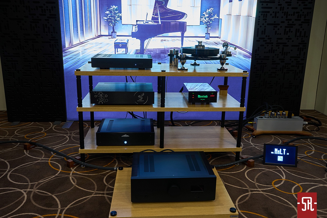 Szczerze? Ten tercet tak naprawdę odwiedziłem z przez wzgląd na jednego delikwenta. Nie żebym z resztą wystawców miał kosę, ale mimo tego, że w większości byli to rodacy, nie miałem na ów pokój żadnego pomysłu. A zaszedłem, przez wzgląd na producenta okablowania NxLT. Jest podobnie do mnie w pozytywnym znaczeniu nie do końca zrównoważony psychicznie. Nadajemy na tych samych falach i gdy zrządzeniem losu kilkukrotnie spotykaliśmy się na korytarzach wystawy, w sobie tylko znany sposób, czyli dokuczając nawzajem ustaliliśmy, że wpadnę na jedną z jego prezentacji. Miał ich bodajże trzy lub cztery – nie pamiętam dokładnie, bo przy tempie naszych konwersacji połowa informacji idzie w tak zwane powietrze. Rozstaliśmy się w śmiechu i za kilka chwil zaliczyłem pierwszą. Usiadłem i pomyślałem, że nie będę go kopać, bo to nie jego wina. Poszedłem na drugą. Cóż, może lepiej, ale nadal brak motywu zabrania głosu. I gdy miałem po angielsku nic nie mówiąc cichaczem wymiksować się z próby znalezienia czegoś ciekawego z jego zabawkami w jednej z ról, nagle kolejny raz staje przede mną. Mówię o porażkach, on niespecjalnie zaprzecza, ale nie daje za wygraną i ciągnie mnie do tytułowego przybytku. Siadamy i już razem słuchamy. Brzmienia kolumn i elektroniki nie znam, za to wiem, co potrafi okablowanie Ether. Po kilku minutach słyszę, że to, za co ludzie lubią jego druty, jest nieco przerysowane – o co chodzi, znajdziecie w moim teście tej serii okablowania. Szukam winowajcy i kurde widzę, że gramofon tylko się kręci, a gramy z plików. Poprosiłem Roberta o zmianę źródła – sam bym tego nie robił, bo wiedząc, że wystawcy chcą robić nimi tylko dobre wrażenie, a nie z nich grać, już mi się znudziło o to prosić – i eureka. Może nie był to nokaut, ale pojawiła się energia, atak i gładkość. A najważniejsze, że przestała krzyczeć wyższa średnica. Na ile było to maksimum możliwości tej sprzętowej zbieraniny, wiedzą tylko wystawcy. Dla mnie natomiast w tym momencie ważna była możliwość przyjemnego posłuchania tej konfiguracji w wersji analogowej. Wersji, której bez działania bohatera akapitu nawet w momencie odwiedzenia przeze mnie do tego pokoju prawdopodobnie by nie było i cały pokaz spaliłby na panewce. Tymczasem finalnie było ok. Na koniec dodam, iż dodatkową wartością dodaną tej wizyty oprócz tematu do opisania było umówienie się z producentem kolumn na sesję testową. W kwestii gramofonu zaś, na obecny moment panuje między nami pieczołowicie kultywowana od wielu lat stabilna cisza.