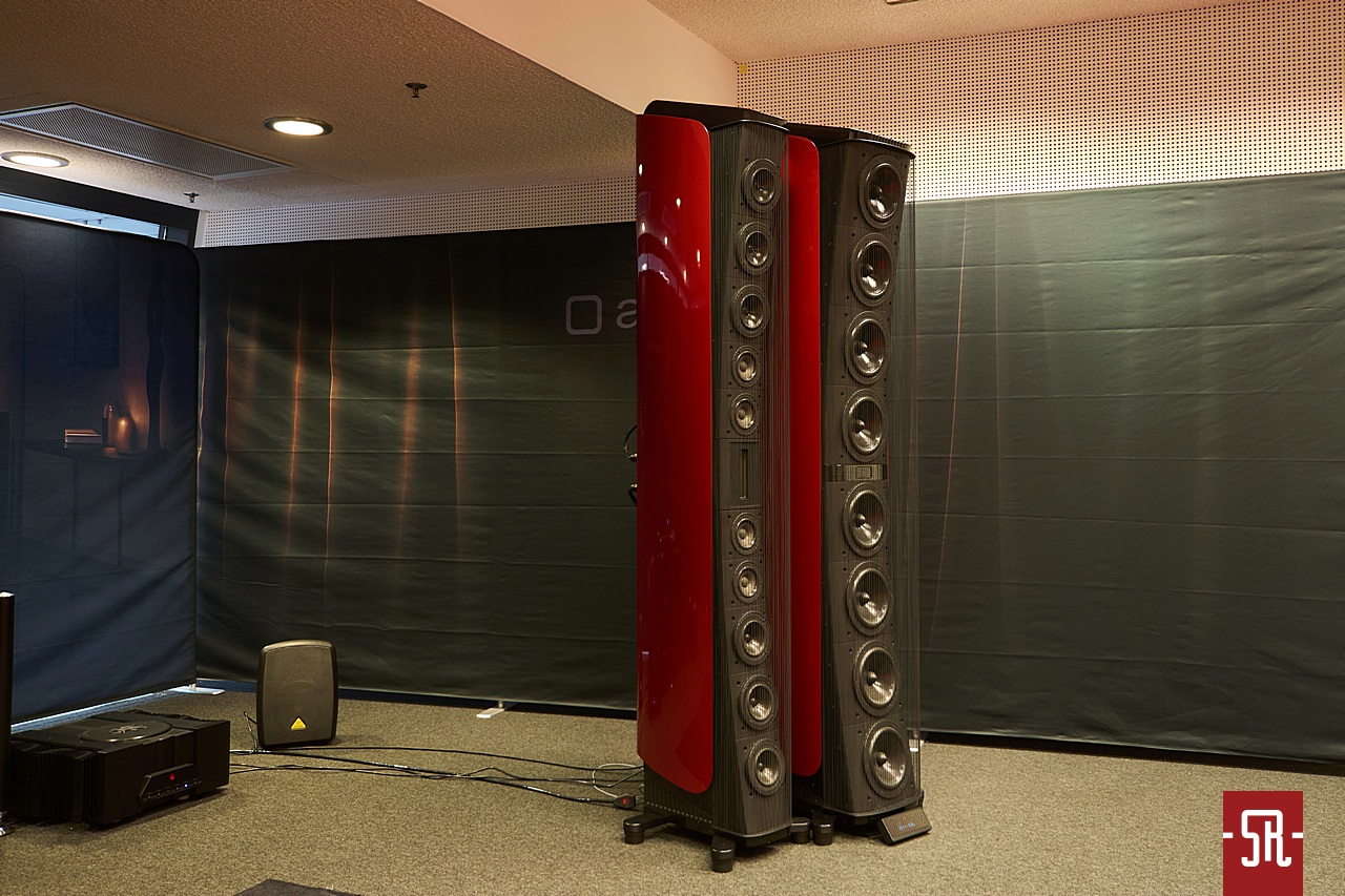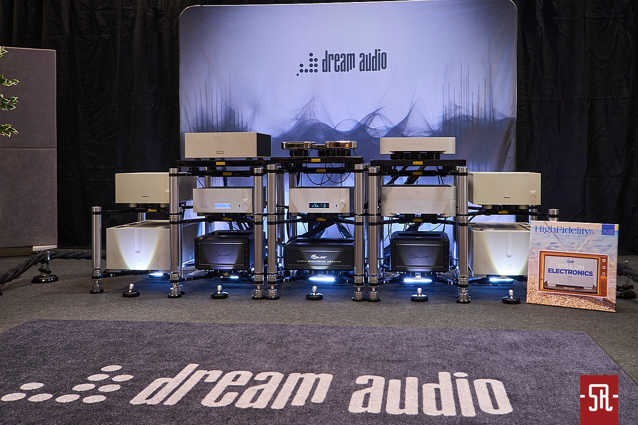 Ten system nie tylko wyglądał, ale także zjawiskowo grał. Naturalnie wszedłem, żeby się z nim zapoznać z prozaicznego powodu chęci poobcowania z zestawem z wielkimi zespołami głośnikowymi. Na co dzień takiego używam i lubię sprawdzić, gdzie aktualnie jestem z rozmachem i jakością prezentacji. A, że przy okazji wiem, iż to co uzbierałem nie jest najlepszym na świecie, zawsze nie tylko z chęcią, ale także z pewnego rodzaju marginesem pokory podchodzę do oceny podobnych szalonych setów. Być może wielu z Was takim stwierdzeniem jest zdziwiona, ale zapewniam, gdy do takiego stanu sprzętowego kiedyś dobrniecie, podchodząc do tematu bez napinki i przerostu swojego ego zrozumiecie, iż pokora w stosunku do podobnych konfiguracji to nic poniżającego, tylko szacunek dla wyborów innych bratnich osobników w naszym hobby. Niestety do tego trzeba emocjonalnie dorosnąć, co mnie po wielu bezsensownych wewnętrznych potyczkach ze swoim duchowym mistrzostwem świata po jakimś czasie udało się osiągnąć. Wracając do zestawu zasadne jest zadanie pytania co z dźwiękiem. Otóż zagrało z ekspresją, namacalnością, bezpośredniością uderzenia, otwartością przekazu w pełnym spektrum wolumenu, czyli tak jak oczekują od podobnych zbieranin podobne do mnie tygrysy. A muszę w tym momencie wspomnieć, iż panowie nie szczędzili decybeli podczas pokazów. Mieli czym dmuchnąć – kolumny były duże z dużymi driverami, a elektronika bez problemu spełniała ich wymogi prądowe, wiedzieli, że mogą popuścić wodzy fantazji, dlatego częstowali odwiedzających niepozostawiającymi złudzeń wrażeniami zderzenia ze ścianą solidnej energii. Przynajmniej dla mnie na pierwszy rzut ucha. Do czego piję? Spokojnie, tylko zaznaczam na dłuższą metę mogący nieco doskwierać słuchaczowi pewien aspekt. Otóż, gdy po kilu kawałkach zjawiskowej kawalkady muzycznej zacząłem analizować całość pod kątem swoich wyborów, zauważyłem, że w niektórych kwestiach całość w dobrym rozumieniu tego słowa nieco bym przybrudził i lekko utwardził. Chodzi o to, że wszystko było podawane na tacy jak smaczne potrawy, ale bez żadnych przypraw i do tego jeszcze z mogącą czasem zaburzyć czytelność pracy kontrabasu krągłością – chodzi o lekkie napompowanie nader wyrazistego brzmienia z mocnym akcentem soczystości, a to po dłuższym czasie prosta droga do zamęczenia słuchacza nawet najbardziej ulubioną muzyką. Prezentowanie wszystkiego w krystalicznej postaci i z nadmiarem krągłego body jest zwyczajnie meczące i trzeba nieco uplastycznić przekaz w wyższych partiach częstotliwościowych i utwardzić w niższych, czego w tym przypadku minimalnie czasem brakowało. Ale zaznaczam, to tylko moje osobiste dywagacje, które z pewnością łatwo da się wdrożyć w życie. Abstrahując jednak od subiektywnych opinii całkowicie rozumiem takie strojenie, bo wystawa ma pokazać maksimum jakości i drapieżności danej konfiguracji, co finalnie i tak w warunkach domowych, jeśli nie skoryguje dedykowane pomieszczenie – tutaj mieliśmy wielką kartonowo-gipsową salę, to bez problemu dostroimy okablowaniem lub doborem sprzętu towarzyszącego. Reasumując dobrze, że poświęciłem tej układance dobrych kilkanaście minut.