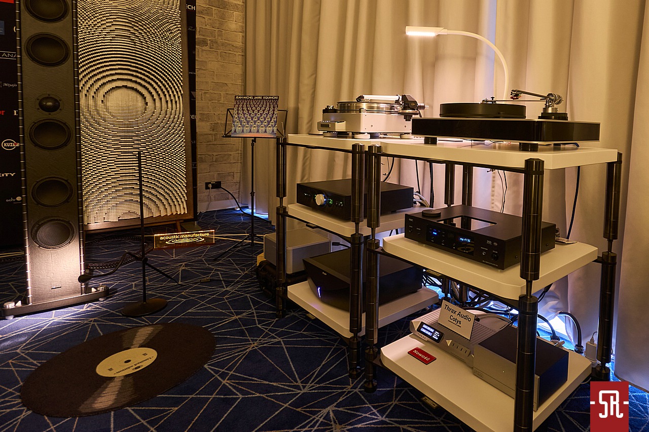 Oczywistą oczywistością jest, że żadna z przed momentem zabawek nie wydałaby głosu, gdyby nie dzieła spod ręki Rumena Artarskiego, czyli wzmocnienie marki Thrax. Wzmocnienie, które zapewniło nie tylko stosowną dawkę prądu do jednak wielkich kolumn, ale także potrafiło je utrzymać w ryzach w przecież bardzo mocno niesprzyjających zakresowi basu pomieszczeniu hotelowym. Powiem tak, czego bym nie napisał o źródle i kolumnach, Thrax z pewnością w całym tym przedsięwzięciu pokazowym był na równi ważnym dla niego elementem toru. A gdy już tak rozdrabniamy pokaz na poszczególne składowe, nie należy zapominać o stabilizujących system meblach spod znaku NEO High End. Co mnie tak przypiliło ze wspominaniem o akcesoriach? Otóż trzeba oddać prawdę, że słusznie, ale Marcin po serii swoich relacji dostał na Facebook-u reprymendę za pomijanie tego tematu. Wówczas ja zapewniłem interlokutora, że jeśli tylko będzie o czym wspominać, nie zapomnę tego nagłośnić.