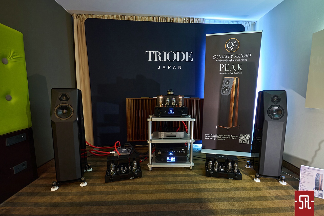 Tego na bank nie wiecie, ale widoczny na zdjęciach zestaw w tym roku to całkowity przypadek. Polski dystrybutor kolumn Peak Consult z uwagi na lekkie zawirowania zdrowotne spowodowane nadmiernym obciążaniem kręgosłupa podczas handlowania High End-em AVS 2025 miał sobie odpuścić. Los jednak chciał, że stało się inaczej. I nie wiem, jak odebraliście to Wy, ale dla mnie dobrze. Otóż mimo chęci absencji został poproszony przez producenta kolumn o pomoc marce Triode Japan w zapewnieniu jej stosownych zespołów głośnikowych. Pan Andrzej wysysając kindersztubę z mlekiem matki naturalnie nie odmówił, dlatego bardzo dobrze znając czekające na niego warunki lokalowe postawił na monitory w podłogowej obudowie w postaci modelu Sonora, które napędzała integra Junone 845 SE. Czy dobrze? Otóż jeszcze, gdy dzwonił do mnie z informacją o takim rozwoju sytuacji, nie był do końca pewny, czy to się sprawdzi. Jednak znając od podszewki nie tylko nieobliczalność pomieszczenia, jak i możliwości kolumn finalnie wyszedł z całego przedsięwzięcia z tak zwaną tarczą. Muzyka nosiła znamiona bardzo esencjonalnej, w na tyle dobrym znaczeniu tego słowa, że sprawiała bardzo sugestywne wrażenie obcowania z artystami dosłownie na wyciągnięcie przysłowiowej ręki. Gdybym miał opisać to, co zastałem w tym pokoju, wyglądało to tak. Było diabelnie ciasno – pierwszy rząd stał 1 metr od kolumn, a mimo to była przestrzeń do wykreowania ciekawych sesji muzycznych z namacalnością wokalizy jako prywatne występy włącznie. Jak udało się to zrobić, pytajcie pana Andrzeja, ja nie mam pojęcia.