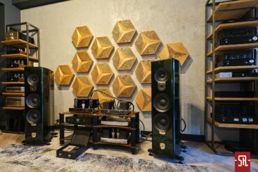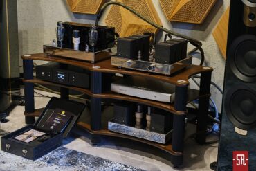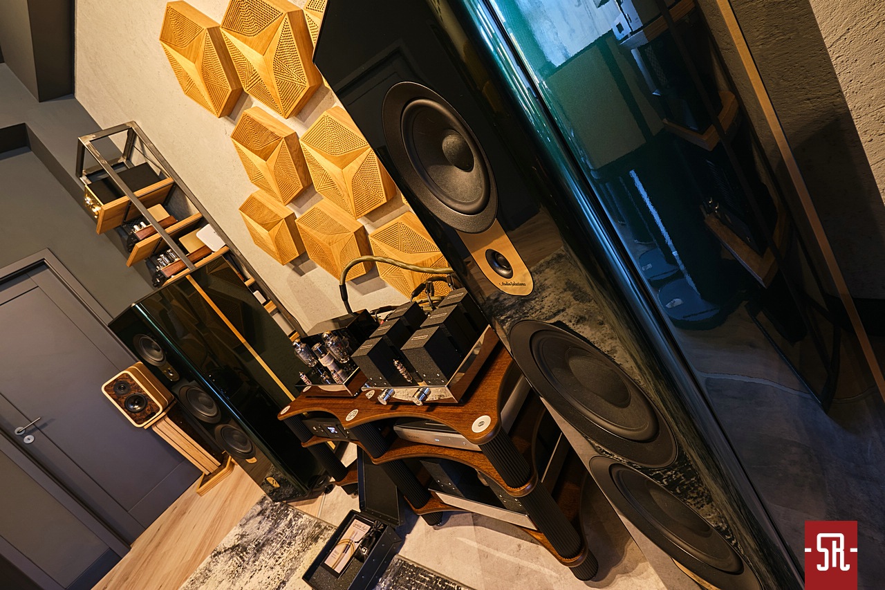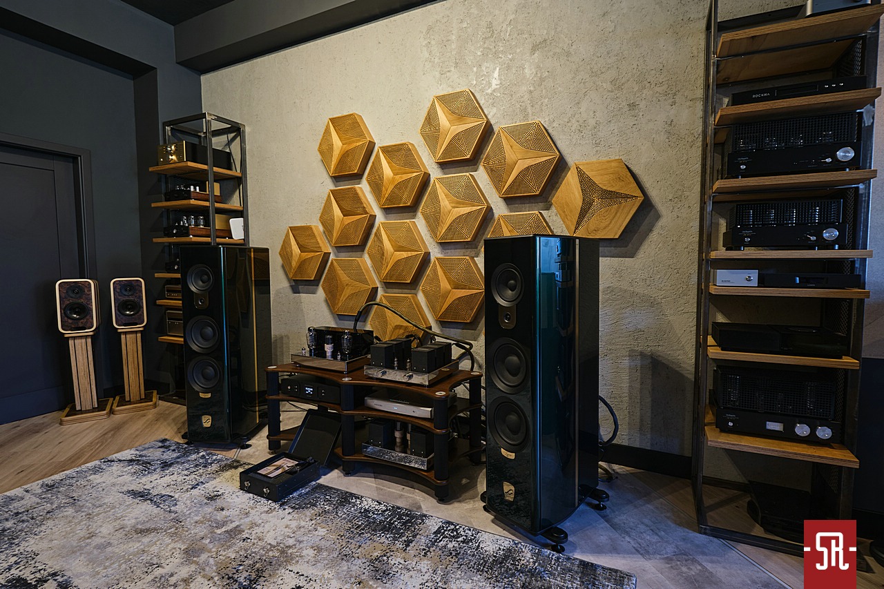 Jeśli chodzi o zaproponowany przez Premium Sound drugi system w głównym pokoju prezentacyjnym to opierał się on o w pełni aktywne zespoły głośnikowe. W tej roli wystąpiły monitory Sveda Audio, które finalnie miały dwie odsłony. Pierwszą było wykorzystanie li tylko podstawkowych Jupiterów, by po czasie zaproponować zestaw wzbogacony o aktywny subwoofer Wombat. Co było powodem prób? Naturalnie w opinii niektórych słuchaczy brak należytej energii dźwięku, które, aby zadowolić wszystkich skorygowano pozostawieniem systemu w konfiguracji 2+1. Ok., kolumny kolumnami, a co z resztą zestawu? Jak obrazują fotografie jako źródło wystąpił streamer rumuńskiej Rockny w towarzystwie przetwornika D/A Lampizator Horizon. Idąc dalej tropem konfiguracji już bezpośrednio karmiącego kolumny funkcję przedwzmacniacza liniowego realizowała identyczna jak w poprzednio opisywanym zestawie dzielona jednostka Zikra Audio. Uzupełniając listę jestem zobligowany wspomnieć jeszcze o okablowaniu Dyrholm Audio i polskiej manufakturze akcesoriów antywibracyjnych Graphiite Audio, z portfolio którego wykorzystano platformę pod przetwornik i podstawki pod okablowanie. Jak widać, system nieco mniej skomplikowany od strony ilości komponentów – brak układu wzmacniającego sygnał, który jest w już w kolumnie, ale dzięki finalnemu zastosowaniu dodatkowej sekcji niskotonowej, nieodstający poziomem energii od tego z dużymi kolumnami Audiosolutions z wcześniej przywoływanego pokazu. A pokusiłbym się wręcz o stwierdzenie, że w odniesieniu do aspektu energii set Svedy był nawet bardziej ekspresyjny. Oczywiście takie postawienie sprawy dało inną estetykę dolnego zakresu, który po dłuższym osłuchaniu się miał sporo do powiedzenia także w środkowym paśmie. Jak to wypadło w wartościach bezwzględnych? Cóż, z tego konglomeratu elektroniki i kolumn znałem tylko przedwzmacniacz liniowy, dlatego nie oceniam jakości, a jedynie estetykę brzmienia, która w kilku aspektach była dość odległa od pierwszego występu. Głownie chodziło o estetykę podania dolnego zakresu i przez to nieco inne formowanie w obydwu przypadkach kontroli oddawanej energii. W wersji Sveda Audio było soczyście i raczej miękkawo, a Audiosolutions w dobrym rozumieniu słowa twardo, dzięki czemu ten zakres oferował lepszy rysunek brylujących w nim instrumentów. Co było lepsze? Jak zwykle to zależało od tego, co komu w duszy gra, gdyż słyszałem opinie in plus w odniesieniu do obydwu zestawów, dlatego zwycięzcy jako takiego nie było. Były inne sposoby widzenia tego samego materiału muzycznego, a który tak naprawdę dla kogoś jest lepszy i tak potencjalny zainteresowany przed zakupem będzie musiał zweryfikować osobiście.